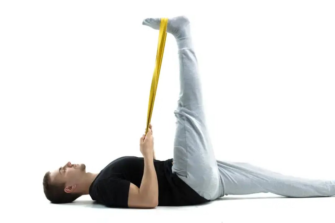 This is a single leg hip extension strengthening exercise. Lie down on your back, place your heels on an exercise bench or Plyo Box and bend both knees to 90 degrees. Raise the non-target leg off the ground into 90 degrees hip flexion. Keep the target leg’s heel planted and drive it downwards to raise the pelvis off the ground. Keep the spine neutral by bracing the core prior to lifting up the pelvis.