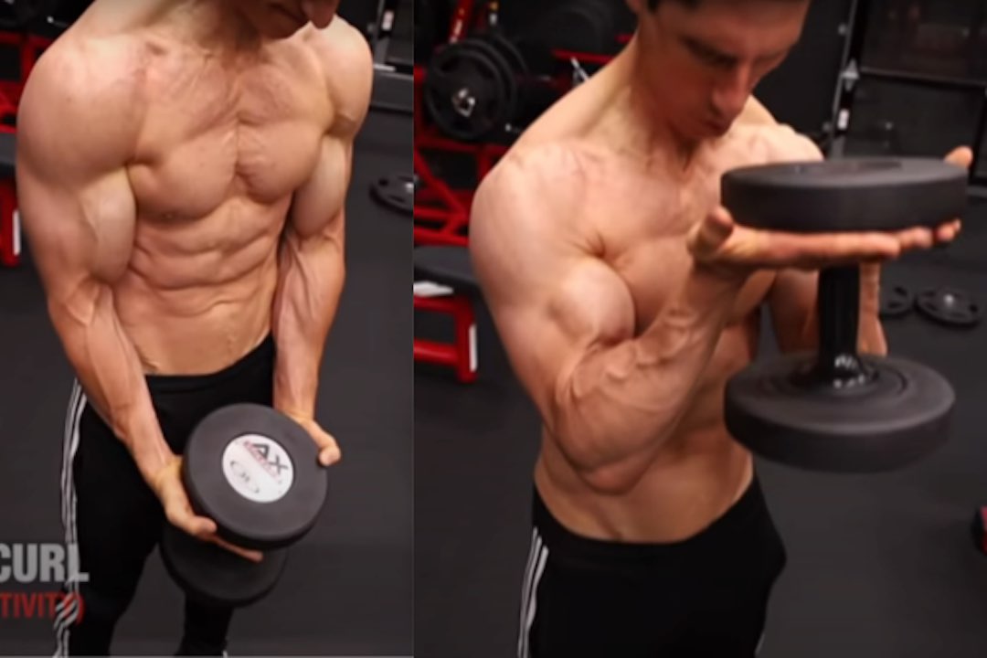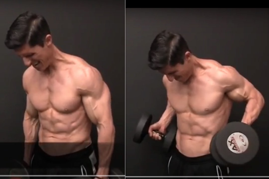 The movement uses grip manipulation to really work your biceps—by resting the top of the vertical dumbbell on your palms, rather than gripping the sides, you put maximum tension on your bicep, and less on the forearm.