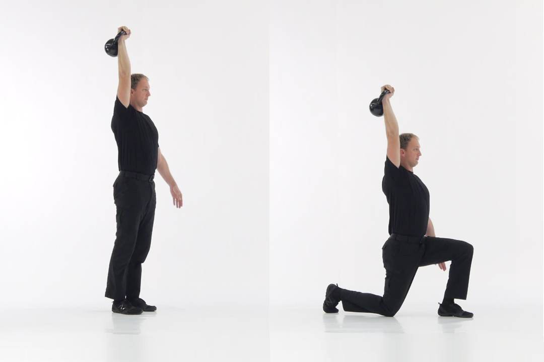 An advanced version of a standard lunge, this should only be attempted after a proper warm up and by those that can comfortably perform a kettlebell clean and press. By incorporating the overhead element, this exercise also targets the shoulders, triceps and lower back.