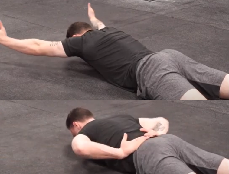 1. Start in a prone position by laying on your stomach with your hands behind your lower back (like you’re being handcuffed).