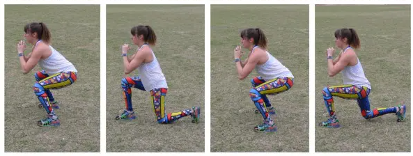 Jump back into the squat and then lunge on the other side. Move quickly, exploding up off the ground to switch.