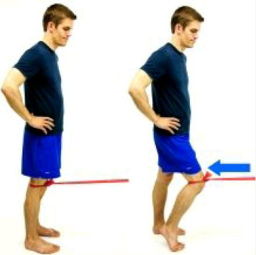 This is a single leg hip extension strengthening exercise. Lie down on your back, place your heels on an exercise bench or Plyo Box and bend both knees to 90 degrees. Raise the non-target leg off the ground into 90 degrees hip flexion. Keep the target leg’s heel planted and drive it downwards to raise the pelvis off the ground. Keep the spine neutral by bracing the core prior to lifting up the pelvis.