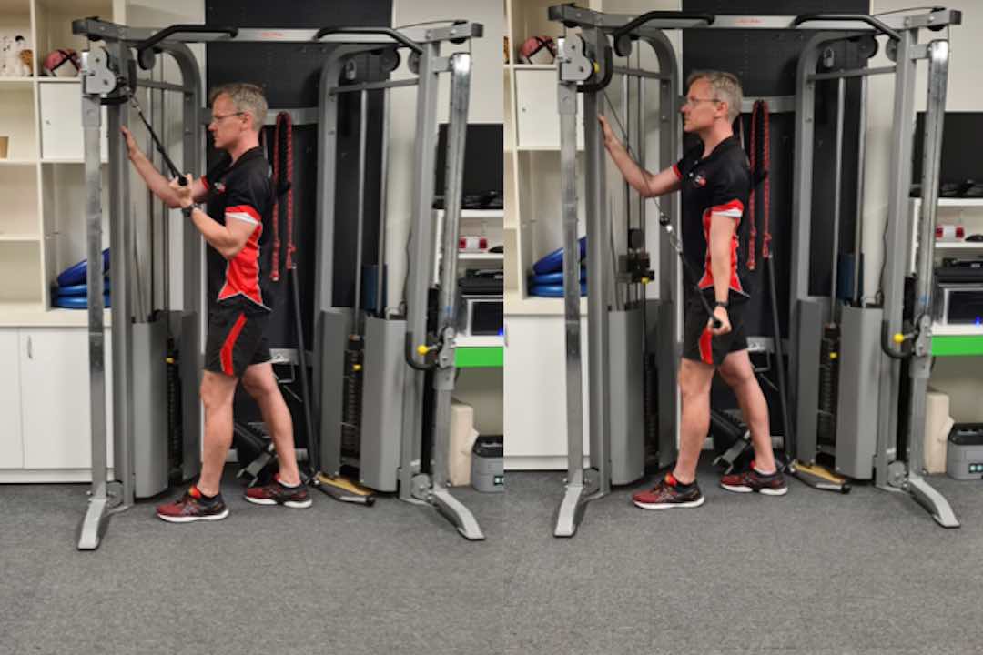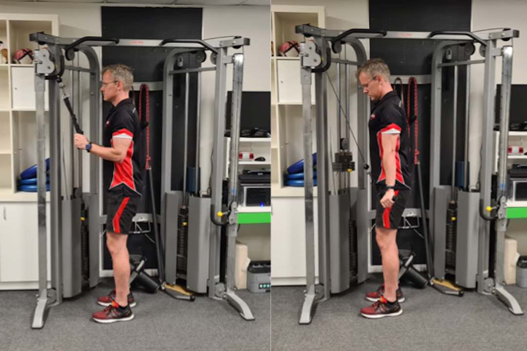 This variation on your typical Tricep Push uses the handle attachments to really to get the outer aspects of your triceps firing! Make sure you push all the way down to the bottom and that your arms straighten out at the bottom!